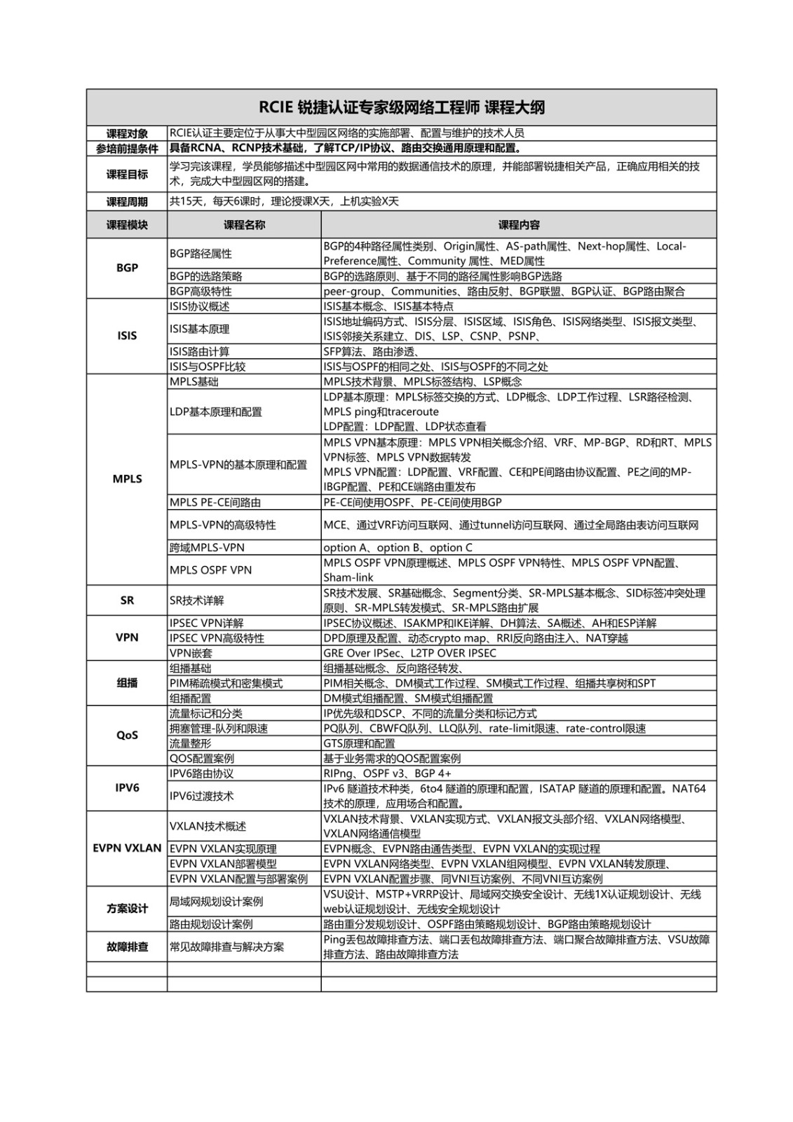 RCIE-Routing and Switching 銳捷認證互聯(lián)網(wǎng)專家-路由交換方向,主要定位于大型復雜網(wǎng)絡的規(guī)劃、設計和管理的專業(yè)技術人員從業(yè)資格認證。 適用對象: 銳捷工程師/渠道工程師、從事路由交換技術工作的資深工程師、路由交換技術愛好者 能力標準: 認證人員對大型網(wǎng)絡整體架構設計、規(guī)劃與管理了解非常深入,能夠對集團性網(wǎng)絡進行整體設計、實施與運維管理,具備網(wǎng)絡技術方面最高級別的綜合能力。 考試內容: BGP路由屬性和高級特性、ISIS原理、ISIS應用、MPLS原理和應用、SR原理和應用、IPSec技術原理和應用、組播技術原理和應用、QoS技術原理和應用、IPv6技術原理和應用、EVPN VXLAN技術原理和應用、局域網(wǎng)規(guī)劃設計和銳捷典型方案、路由規(guī)劃設計和銳捷典型方案、常見故障排查與解決方案。 |