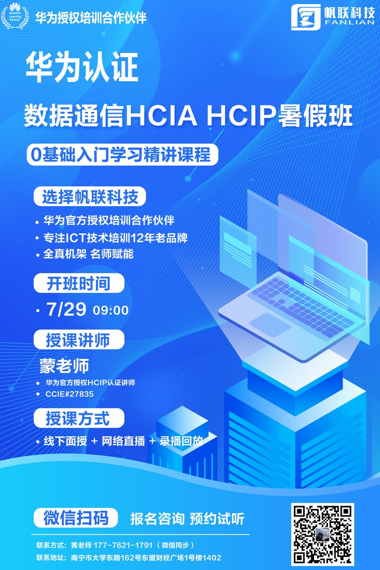 十二年數(shù)據(jù)通信認證培訓(xùn)經(jīng)驗沉淀,帆聯(lián)出品,必屬精品! 課程信息:華為數(shù)據(jù)通信方向HCIA HCIP 開班時間:2024年7月29日(周一)早上9:00 時間安排:講完HCIA接上HCIP,其中HCIA 5天課程,HCIP 12天課程 授課講師:蒙老師(CCIE-R&S、華為HCIP認證講師、RCIE-R&S) 授課方式:線下面授 + 網(wǎng)絡(luò)直播 + 錄播回放 備 注:帆聯(lián)HCIA、HCIP涵蓋了HCIE備考所有知識點,學(xué)完即可進入HCIE訓(xùn)練營 報名聯(lián)系:177-7621-1791 黃老師 (微信同號) |